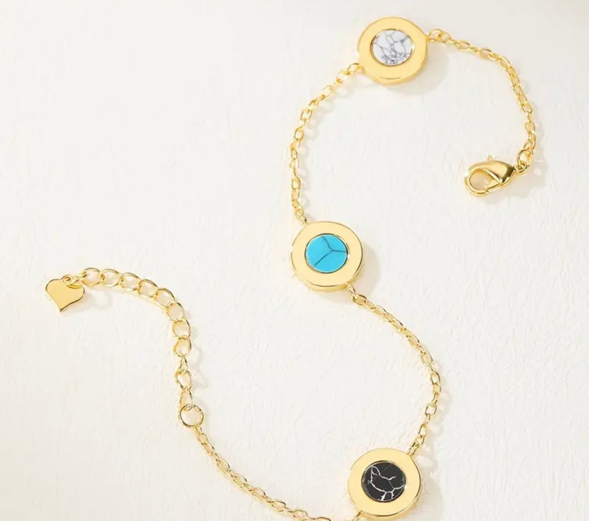 Fun Tri Color Disc Shape Style Bracelet. Copper Alloy with Synthetic Turquoise. Fun for daily wear.