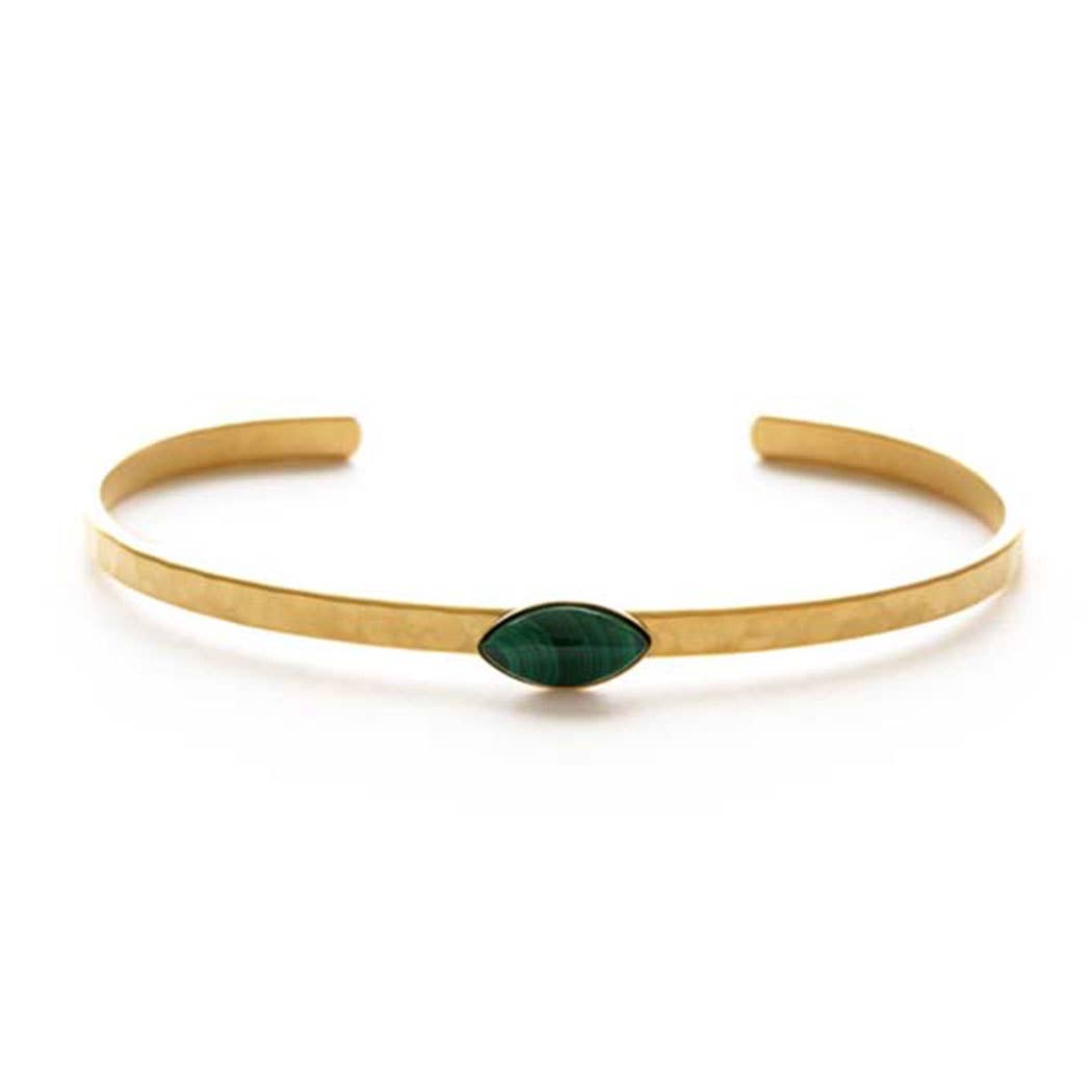 This navette stone cuff is an Amano classic! Semi precious gemstone cabochons set in hammered 1/8" cuff make a great addition to a bracelet stack or are sweet all on their own.