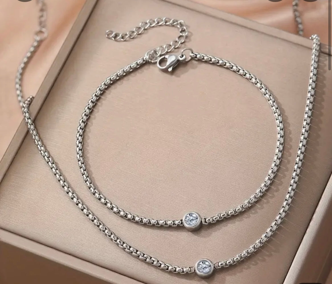 Simple Bezel set Synthetic Clear Stone on Rounded Box Link Chain.18kt plating over Stainless Steel. Comes in Yellow Tone or Silvery tone. Necklace and Bracelet Set. Great for Every day.