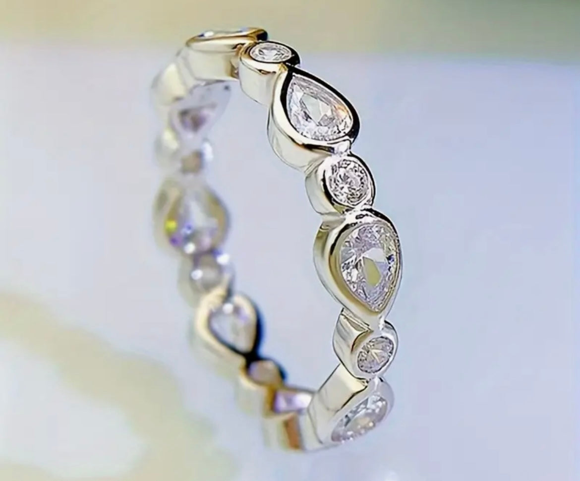Pear and Round Bezel set Cubic Zirconia Comfortable Band, Ring Size 8, plated. Easy Wear.