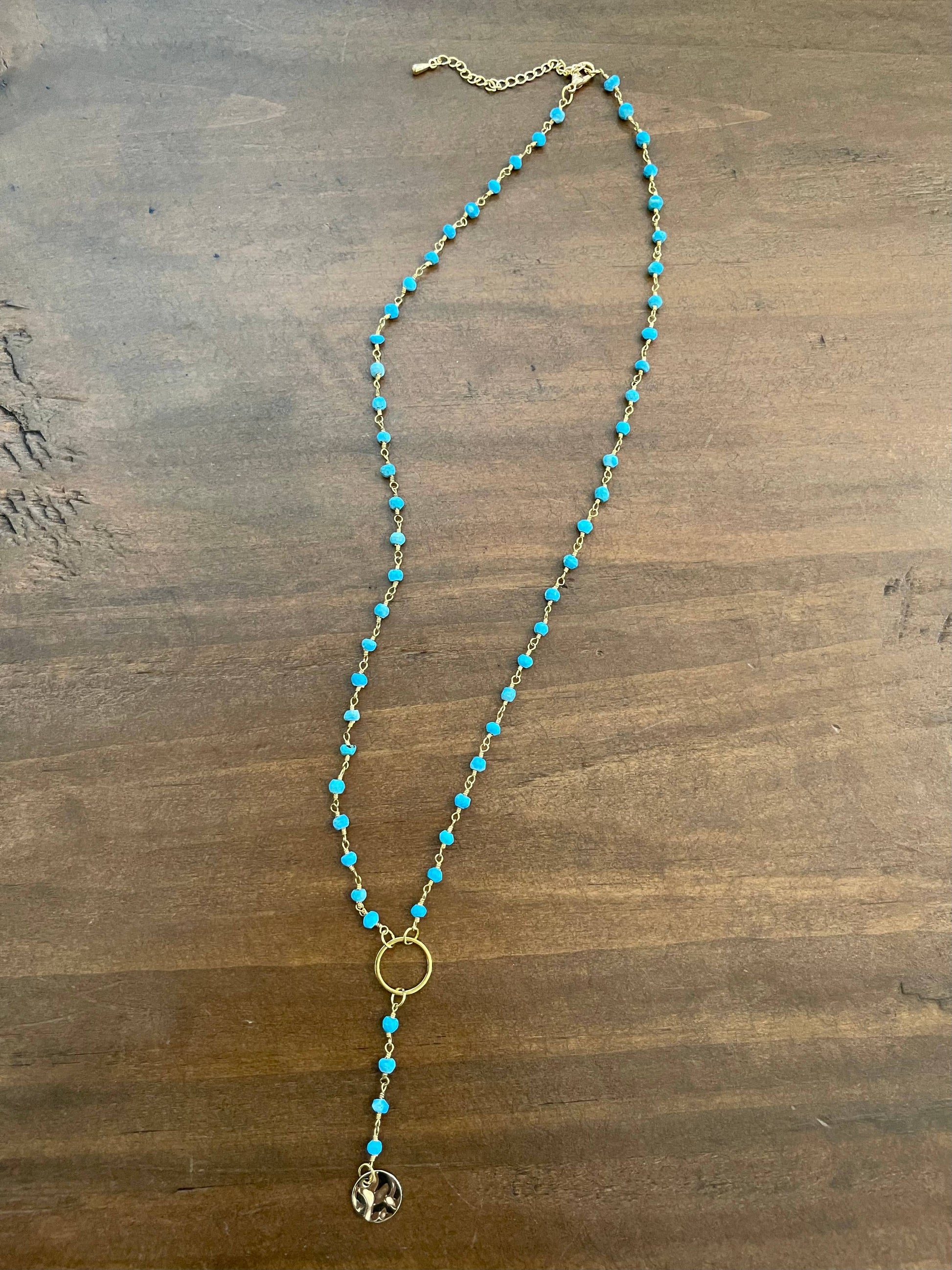 these cute and dainty rosary lariats are unique and amazing. these are such a statement necklace and perfect for all types of outfits! available in turquoise, black, gray.