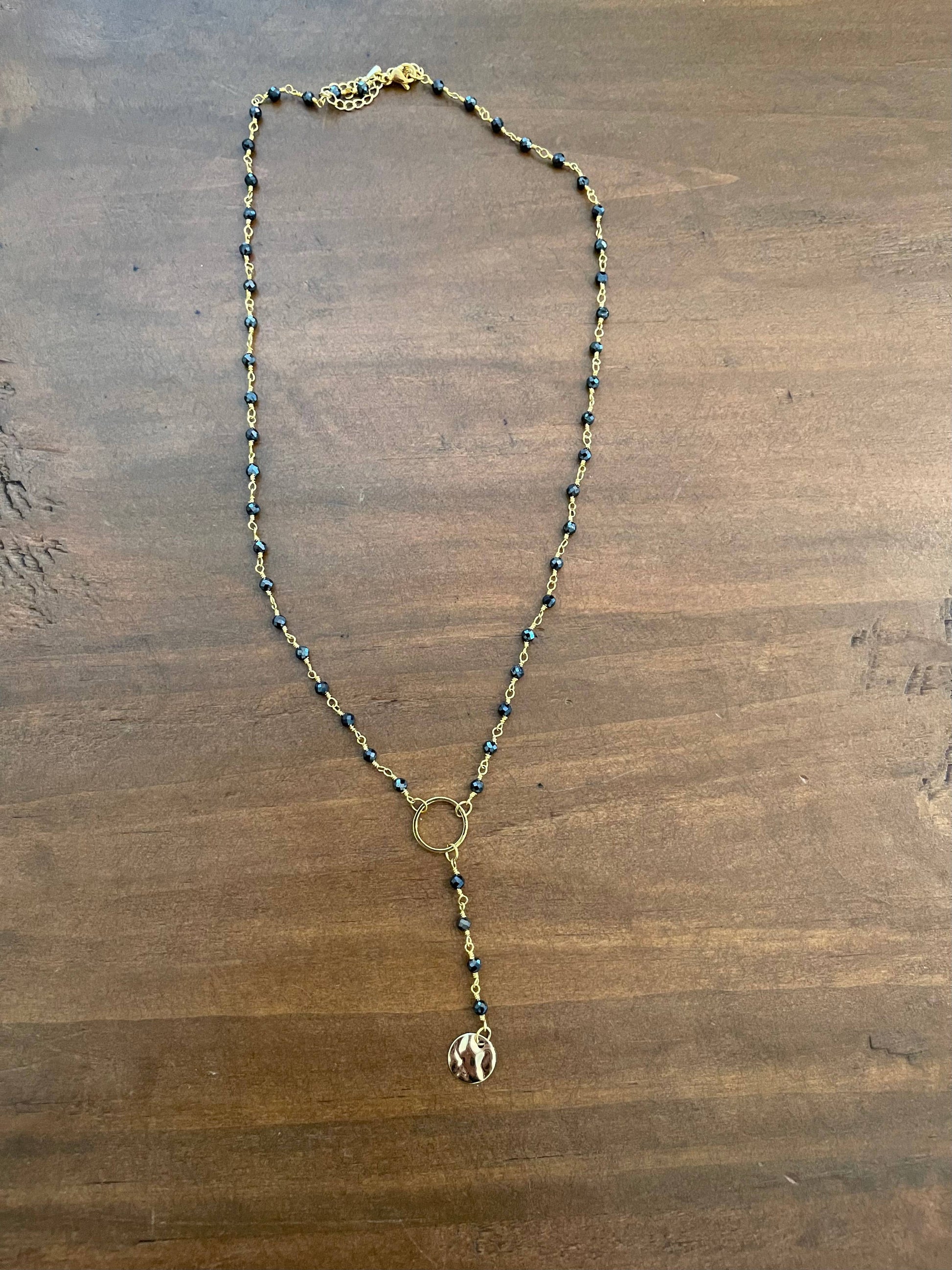-1 rosary lariat necklace in your choice of turquoise, black, gray
